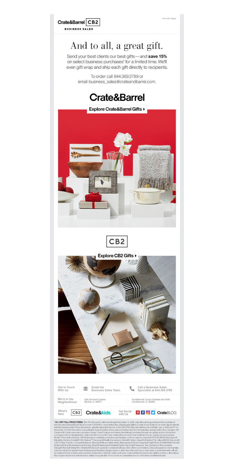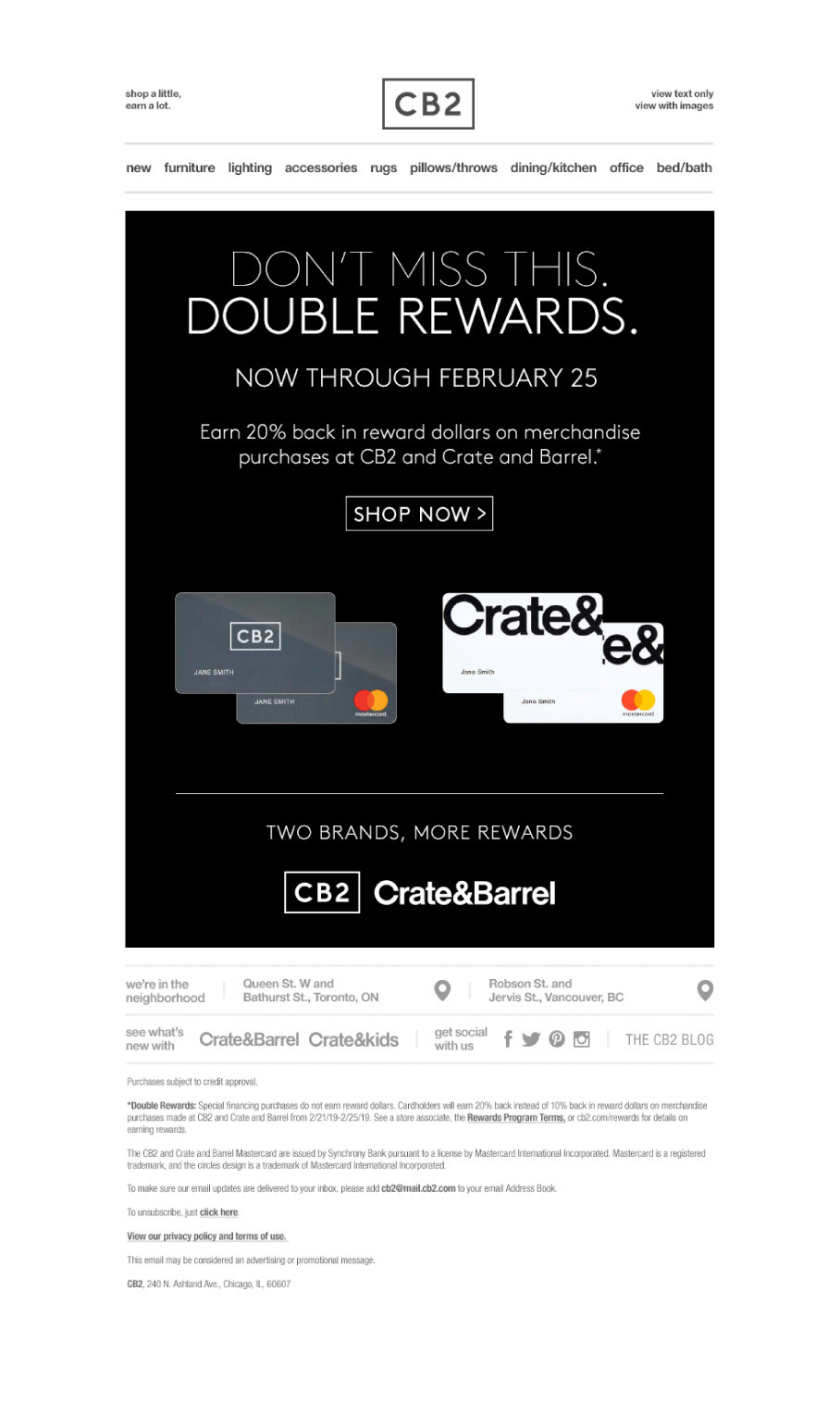 a collection of reactivation, winback, business to business and credit card emails for both the Crate&Barrel and CB2 brands.